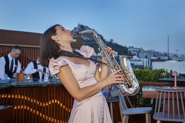 ατμόσφαιρα μεταμορφώνει η εντυπωσιακή σαξοφωνίστρια Διονυσία Γεωργιάδου, η