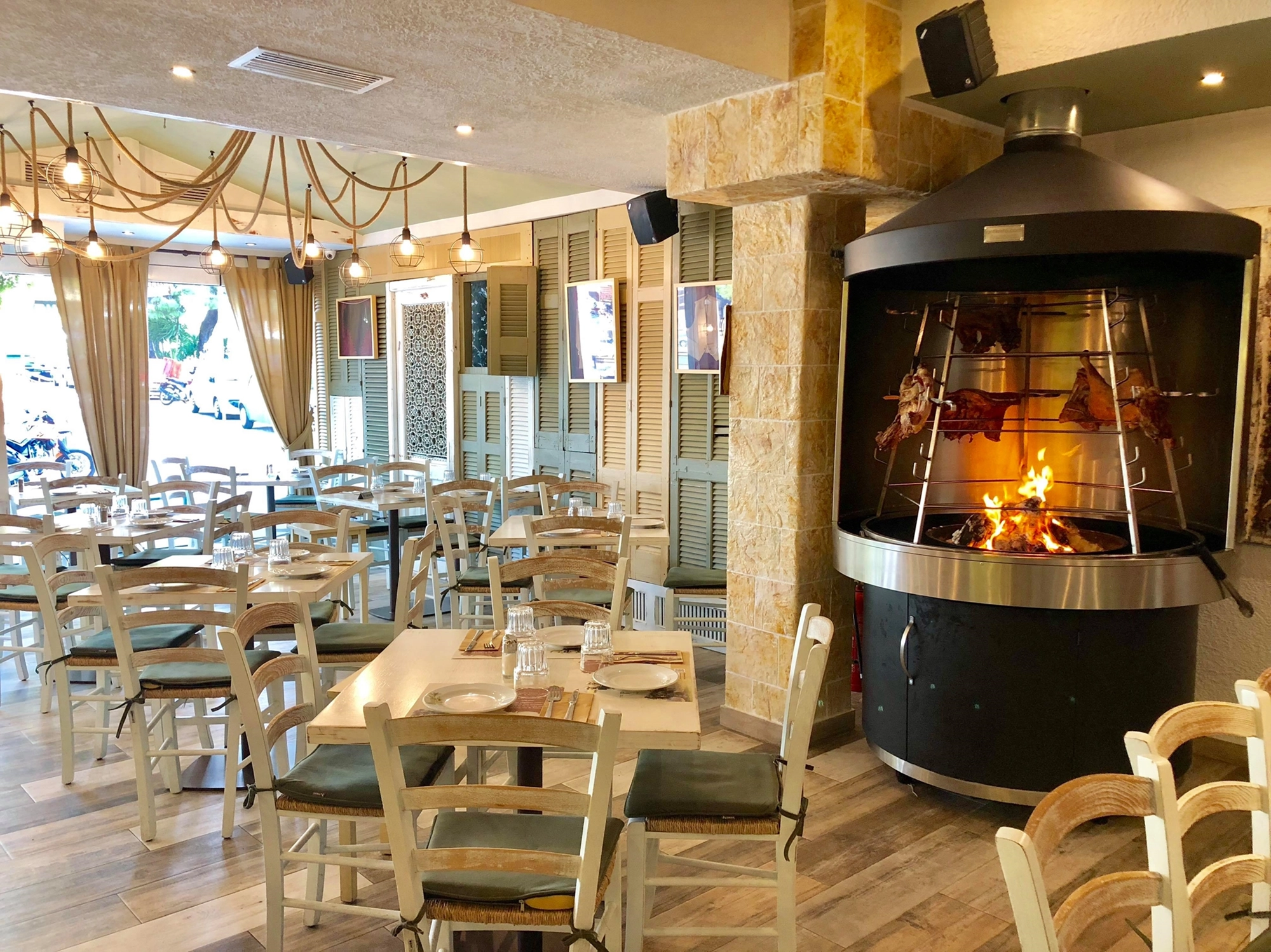 Ο χώρος του φέρνει στο νου ένα φιλόξενο και ζεστό σπίτι, όπου κυριαρχεί η υφή του ξύλου και ο λιτός χαρακτήρας των λευκών τραπεζοκαθισμάτων. Στους τοίχους, θα παρατηρήσετε εικόνες από τοπία και ανθρώπους του νησιού. Αυτό, όμως, που κλέβει την παράσταση οπτικά είναι η αντικριστιέρα στο πλάι του μαγαζιού όπου σιγοψήνεται λαχταριστά στο αρνί.