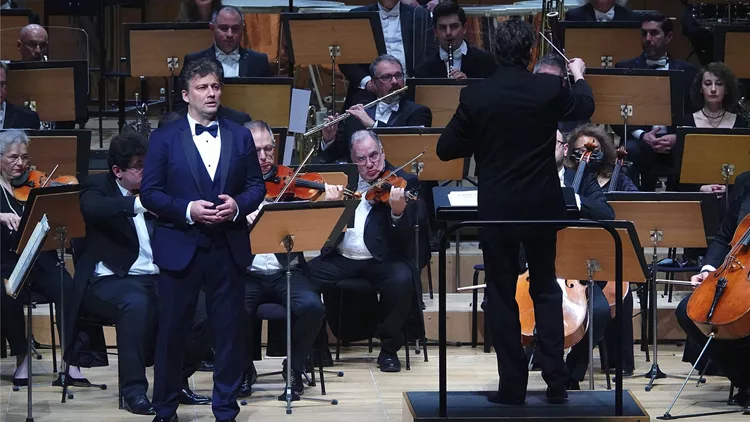 Λεζάντα πρώτης φωτογραφίας: Στιγμιότυπο από το ρεσιτάλ που έδωσε ο διάσημος Γερμανός τενόρος Γιόνας Κάουφμαν στην "Αίθουσα Χρήστος Λαμπράκης" του Μεγάρου Μουσικής Αθηνών (9/2) συνοδευόμενος από την ΚΟΑ υπό τον Γερμανό αρχιμουσικό Γιόχεν Ρήντερ © Χάρης Ακριβιάδης