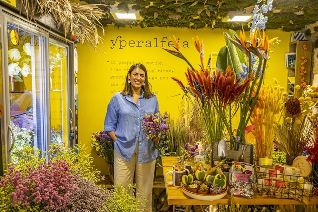 Αφήνουμε το άι ντου, κατηφορίζουμε προς τα Κάτω Πετράλωνα και περνάμε από την άλλη πλευρά του ηλεκτρικού σιδηροδρόμου. Στην εμπορική οδό Κειριαδών στέκεται το μικρό και πολύ όμορφο μαγαζί με φυτά και flower boutique με το όνομα Yperalfeia. Ένα πολύχρωμο μαγαζί που μιλάει στο σήμερα αλλά κλείνει και το μάτι στο παρελθόν. Μας υπενθυμίζει να μην ξεχνάμε και να υποστηρίζουμε τα μαγαζιά της δική μας γειτονιάς. Η Μαρία Παπαδοπούλου σπούδασε Τεχνολόγος Γεωπόνος και έχει ασχοληθεί και με την ανθοδετική τέχνη, ενώ από μικρή έτρεχε στα χωράφια των παππούδων της. Κάπως έτσι πήρε την έμπνευση για το όνομα του μαγαζιού, από τον Αλφειό ποταμό, που κάπως ποτίζει και τον αμπελώνα του παππού της. Το Yperalfeia άνοιξε πριν από 2.5 χρόνια και πλέον πολλοί ζητάνε από την Μαρία να τους φτιάξει μία "ανάσα", δηλαδή χρωματιστά και μυρωδάτα μπουκέτα λουλουδιών. "Έχω μεγαλώσει στο κέντρο και ήθελα να δώσω στον κόσμο μία ανάσα της φύσης", μιλώντας και για την περίοδο της πανδημίας που όλοι ήμασταν κλεισμένοι στα σπίτια μας. Στο Yperalfeia θα βρείτε πολλά είδη φυτών εσωτερικού χώρου και λουλούδια του αγρού που ανανεώνονται κάθε βδομάδα (και αποξηραμένα), κάκτους, παχύφυτα, αερόφυτα, φυτά που δεν θέλουν, γενικά, πολύ πότισμα, μαζί με υπηρεσίες μεταφύτευσης και συμβουλευτική γύρω από τα φυτά και τα λουλούδια.
