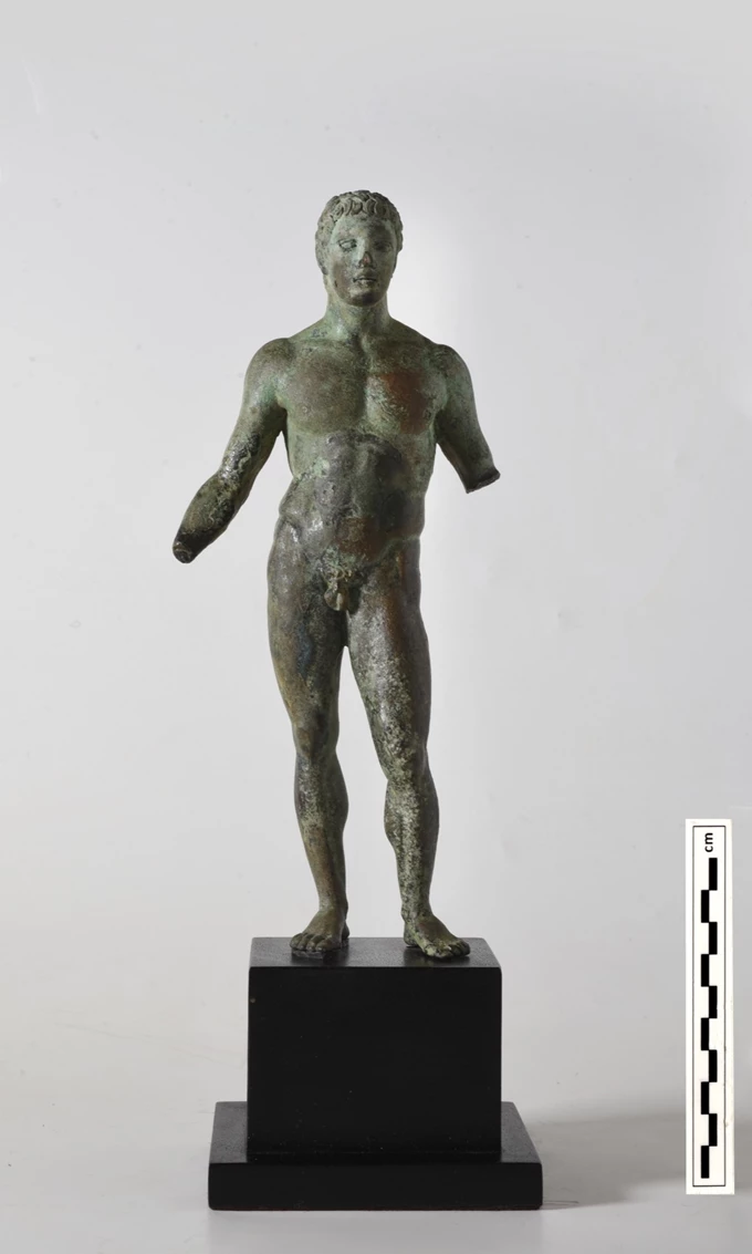 3. Χάλκινο αγαλμάτιο γυμνού νεαρού άνδρα, πιθανόν αθλητή, ύψους 0,24μ. Ο άνδρας παριστάνεται όρθιος, κατενώπιον. Πατά σταθερά στο έδαφος με το δεξί σκέλος. Τα κοντά μαλλιά, ταιριαστά σε αθλητή, αναλύονται σε ακατάστατους βοστρύχους. Θα μπορούσε να χρονολογηθεί στα τέλη του 2ου αι. π.Χ.