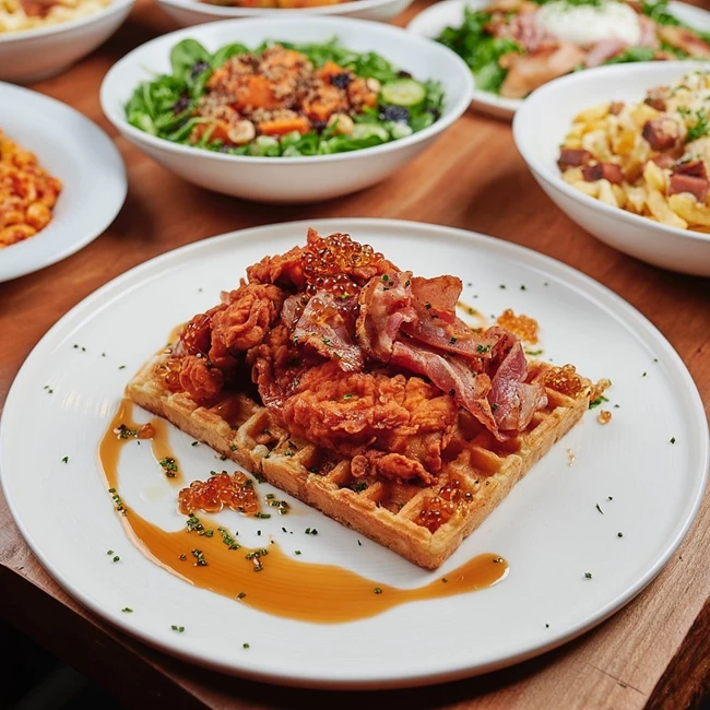 Για εκείνους που επιμένουν σε κάτι εξίσου ΄πλούσιο' και χορταστικό, προτού καν περάσουν στα ενδότερα του μενού, ενδείκνυται η αφράτη βάφλα με τραγανές μπουκίτσες κοτόπουλου και μπέικον, μαζί με σιρόπι σφενδάμου και μαγιονέζα.