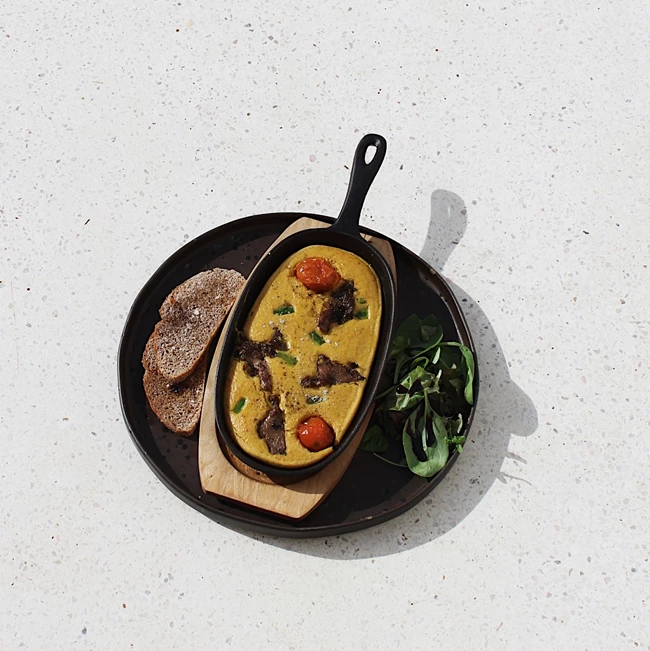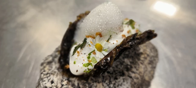 Οι ιδιοπαρασκευές, η φαντασία και η αίσθηση της ισορροπίας χαρακτηρίζουν τις μοντέρνου ύφους γεύσεις της ήδη από το καλωσορίσμα με τις πολύ καλές "μπουκιές" της κρεμμυδόπιτας που παντρεύει όμορφα το άλμυρο με το γλυκό και του μπισκότου τύπου shortbread με φιστίκι Αιγίνης και ωραία κρούστα από καψαλισμένο καλαμπόκι. Το ψωμί της, ένα αφράτο μπριός γλασαρισμένο με miso από γίγαντες, είναι απολαυστικό είτε μόνο του είτε παρέα με το "blue cheese" που φτιάχνει η σεφ από γάλα cashews και ωριμάζει για τέσσερις μήνες.
