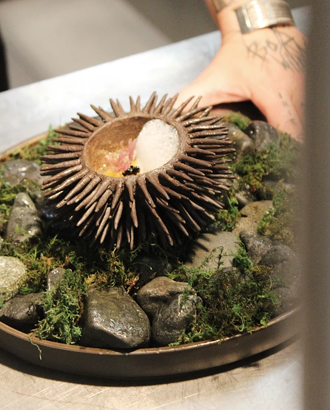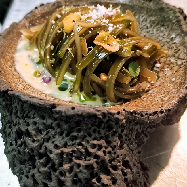 Η αλλιώτικη "χωριάτικη" με αβοκάντο σε νερό ντομάτας, ξύσμα λάιμ και λάδι βασιλικού ανοίγει την όρεξη και αποκτά ενδιαφέρον χάρη στον αφρό αγγουριού και τη γρανίτα από ψωμί ντομάτας που της προσφέρουν επιπλέον υφές. Το κόκκινο λάχανο σε ζύμωση με αγκινάρες Ιερουσαλήμ, σιρόπι λεμονιού, φράουλες, σταφύλι και σούπα από μανιτάρια κανθαρέλες βγάζει πυκνή χειμωνιάτικη γεύση και ποντάρει στις οξύτητες με ισορροπία, ένα στοιχείο που όμως δεν ανιχνεύω στις εικονικές ταλιατέλες φυκιών καθώς τα μούρα σε ζύμωση, ο αφρός από ούζο και το ξύσμα λεμονιού κάνουν το πιάτο μονοδιάστατα όξινο.