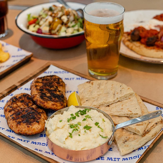 Ποικιλία ελληνικών κρεατικών με σουβλάκια, κεμπάπ, κοντοσούβλι αλλά και burger. Υπό την επιμέλεια του executive chef Τάσου Γιαννόπουλου και με την υπογραφή του ομίλου TerraBlue, γνωστού για εστιατόρια όπως τα "Cherchez la Femme" και "Il Barretto", το "Δε Μιτ Μπόιζ" συνδυάζει παραδοσιακές γεύσεις, όπως σουβλάκι και δημοφιλή πιάτα από την ελληνική κουζίνα, με πιο ειδικές κοπές κρέατος και μαγειρευτές συνταγές