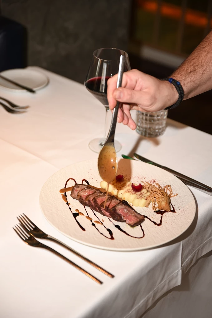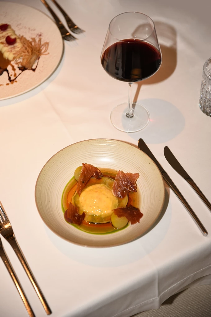 Πρωτότυπα υλικά και ευφάνταστο food styling συνυπάρχουν σε ένα υπέροχο παζλ γεύσεων, με ρυθμό και ένταση. Η σαλάτα από παντζάρια και ραντίτσιο στη σχάρα, εμπλουτισμένη με σπιτικό μαριναρισμένο σολομό, chicory, σαγκουίνι και vinaigrette yuzu σηματοδοτεί μία δυνατή αρχή, για να ακολουθήσουν τα ραβιόλι με burrata, σε συνδυασμό με κολοκύθα, ντοματίνια, τραγανό προσούτο και dashi καπνιστής ντομάτας. Κορύφωση με το κυρίως πιάτο, που θα δημιουργήσει ευχάριστο πονοκέφαλο όσον αφορά την επιλογή: Τρυφερό καλκάνι, με ραγού μήλου και λάχανου, τρούφα, καμένη κρέμα και σάλτσα Bordelaise ή μήπως εκλεπτυσμένη μοσχαρίσια πικάνια, συνοδευόμενη από μανιτάρια enoki, πουρέ πατάτας με χρένο, σκόνη φρούτων του δάσους και σάλτσα μαύρης τρούφας;
