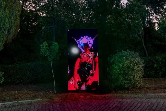 Ένα από τα πρώτα έργα της έκθεσης που συναντάει κανείς, κοντά στο άγαλμα του Κωνσταντίνου, εισάγει το κόνσεπτ με τον πιο διασκεδαστικό τρόπο: αν σταθείτε μπροστά από τις οθόνες, θα δείτε το σώμα σας να μεταμορφώνεται σε μία "εξωγήινη" οντότητα, στοιχείο που επιβεβαιώνει την ικανότητα της ψηφιακής τεχνολογίας να μας "μεταμορφώνει" στον εικονικό αλλά και τον πραγματικό κόσμο.