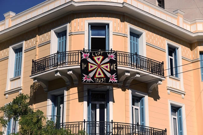 Ακριβώς επειδή οι φωτογραφήσεις έγιναν εν μέσω πανδημίας, δεν υπήρχε η άνεση να γίνουν με τη φυσική παρουσία των καλλιτεχνών. Ακόμα και η διευθέτηση με τους γείτονες όφειλε να είναι προσεκτική -έμπαινα μόνο εγώ στο σπίτι τους για να κρεμάσω το έργο και είχα ένα-δύο φίλους να βοηθάνε εξωτερικά. Οπότε με τους καλλιτέχνες συζητούσα κυρίως το πριν, το σκεπτικό και εκείνοι πρότειναν το έργο που πίστευαν ότι θα ταιριάζει ή ενδεχομένως αν είχαν κάποια προτίμηση ως προς το είδος του κτιρίου όπου θα ήθελαν να το δουν. Πρέπει να πω ότι ήταν φοβερό που με εμπιστεύτηκαν τόσο, δεν το θεωρώ δεδομένο. Στο τέλος τους έστελνα υλικό από τη φωτογράφηση για να λάβω την έγκρισή τους και να προχωρήσω στην αντίστοιχη ανάρτηση.