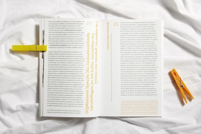 "Σύμφωνα με τον κυρίαρχο λόγο, οι γειτονιές δυτικά της Πατησίων ανήκουν στο παρελθόν. Είναι οι άλλοτε ένδοξες μεσοαστικές περιοχές που σήμερα παρακμάζουν. Είναι οι ασήμαντοι τόποι όπου κατοικεί "ο άλλος”" διαβάζουμε στο κείμενο της Ιφιγένειας Δημητράκου στην έκδοση.