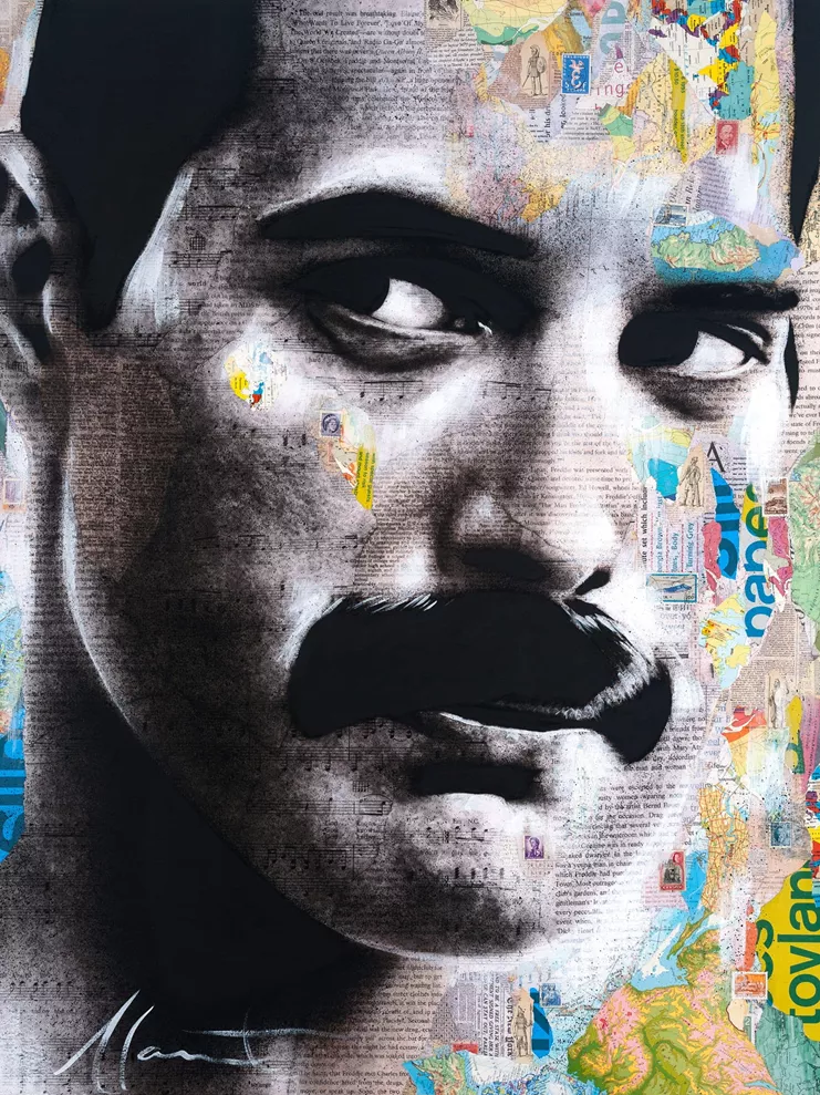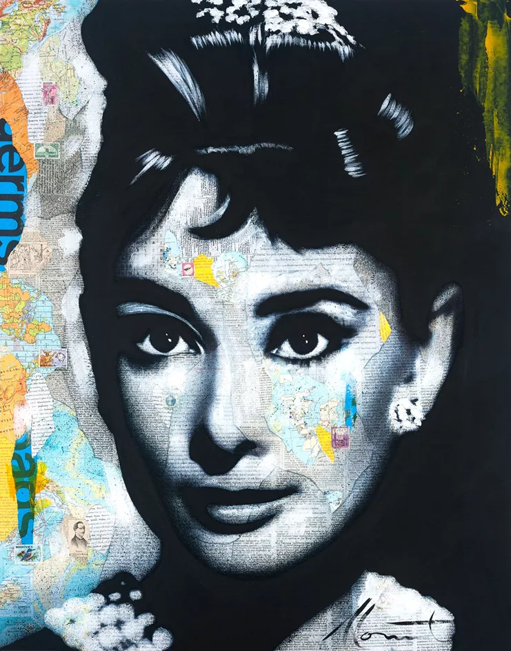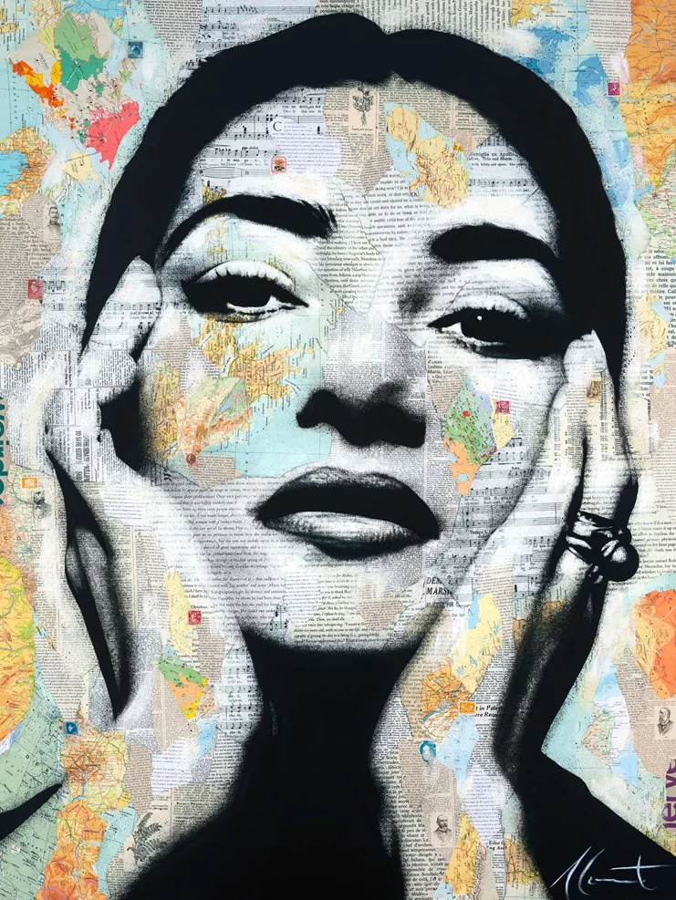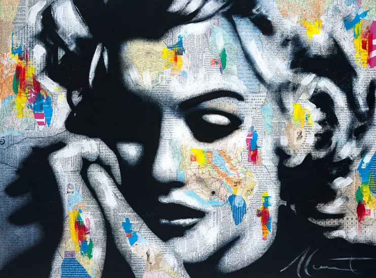 Με την πρώτη του ατομική έκθεση στην Αθήνα, ο Καναδός καλλιτέχνης τιμά μεγάλες μορφές του κινηματογράφου, της μουσικής, της λογοτεχνίας, καθώς και της πολιτικής και κοινωνικής ζωής. Μονρό, Μπόουι, Αντζελίνα Τζολί, Μαρία Κάλλας και η Βασίλισσα Ελισάβετ Β’ αποτυπώνονται σε κολάζ από χάρτες και εφημερίδες, πάνω στα οποία ο Monet ζωγραφίζει στη συνέχεια, αφήνοντας αποσπάσματα των χαρτών και αποκομμάτων να αναδύονται στην επιφάνεια και να γίνονται μέρος του προσώπου