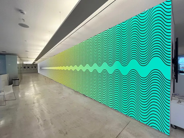 Μια ανάθεση ειδικά για το ΕΜΣΤ, η εντυπωσιακή τοιχογραφία 30 μέτρων της Claudia Comte συνδέει τον κεντρικό χώρο του μουσείου με το φουαγιέ της εισόδου. Το έργο αποτελεί χαρακτηριστικό παράδειγμα της καλλιτεχνικής πρακτικής της Comte που συνδυάζει παραδοσιακές χειροτεχνικές διαδικασίες και σύγχρονη τεχνολογία, με ένα λεξιλόγιο που παραπέμπει σε οργανικά μοτίβα μορφολογίες. Η Comte είναι γνωστή για τις in-situ εγκαταστάσεις, τους πίνακες και τα γλυπτά που αντλούν από τα περίπλοκα μοτίβα και σχήματα που ενυπάρχουν μέσα στην φύση, όπως κύματα, ηχητικά μοτίβα, κάκτοι και σχηματισμοί βράχων. Οι τοιχογραφίες της – που δημιουργούνται ψηφιακά και κατόπιν πραγματοποιούνται με την χρήση βινυλίου, στένσιλ και ζωγραφικής απ’ ευθείας στον τοίχο - μοιάζουν σχεδόν σαν παραισθησιογόνες οπτικές πανδαισίες που καθηλώνουν και περιβάλλουν τους θεατές. Η τοιχογραφία διακρίνεται από ένα εντυπωσιακό εφέ κυματισμού, δημιουργώντας μια δυναμική οπτική κίνηση. Αυτός ο κυματισμός τυλίγεται γύρω από ένα κοίλο σώμα, δημιουργώντας αντιθετικές αντιλήψεις σε κάθε πλευρά. Η προέλευση του φαινομένου του κρουστικού κύματος, είναι μια περίπλοκη χορογραφία χρωμάτων και μορφών που συντονίζεται με την αρχιτεκτονική φυσιογνωμία του μουσείου. Το έργο λειτουργεί σαν μεταφορά πάνω στον αντίκτυπο της ανθρώπινης δραστηριότητας στη φύση, θυμίζοντας πώς ακόμη και οι πιο μικρές ενέργειες μπορούν να δημιουργήσουν κυματισμούς αλλαγής, όπως μια σταγόνα νερού δημιουργεί άπειρα κύματα. Θολώνοντας τα όρια μεταξύ τέχνης, φύσης και αρχιτεκτονικής, το έργο προσφέρει στους επισκέπτες μια μοναδική οπτική και αισθητηριακή εμπειρία. Η έκθεση παρουσιάζεται στο πλαίσιο του θεματικού κύκλου «Κι αν οι γυναίκες κυβερνούσαν τον κόσμο;» του ΕΜΣΤ.