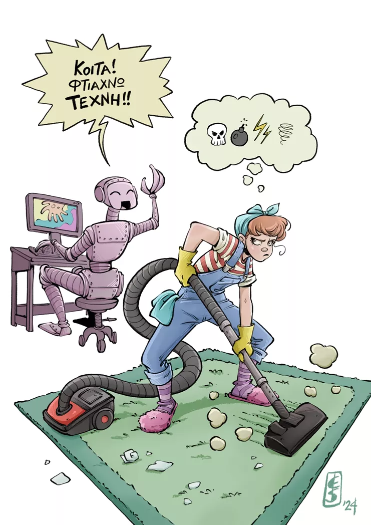 Η Ελληνική Ακαδημία Κόμικς προσκαλεί 45 Έλληνες εικονογράφους και δημιουργούς κόμικς να αποτυπώσουν σκέψεις και θέσεις, αναφορικά με το φαινόμενο της τεχνητής νοημοσύνης που -όπως όλα δείχνουν- θα αλλάξει ριζικά το τοπίο της καλλιτεχνικής έκφρασης.