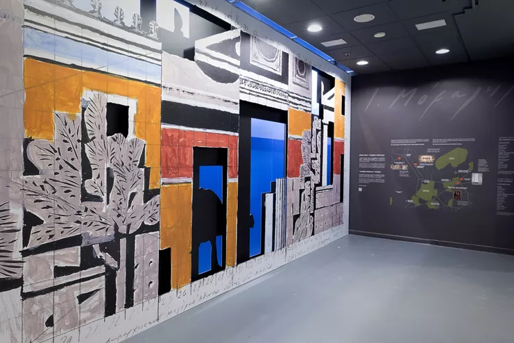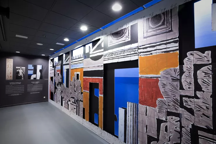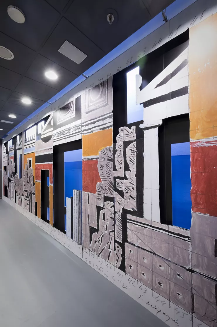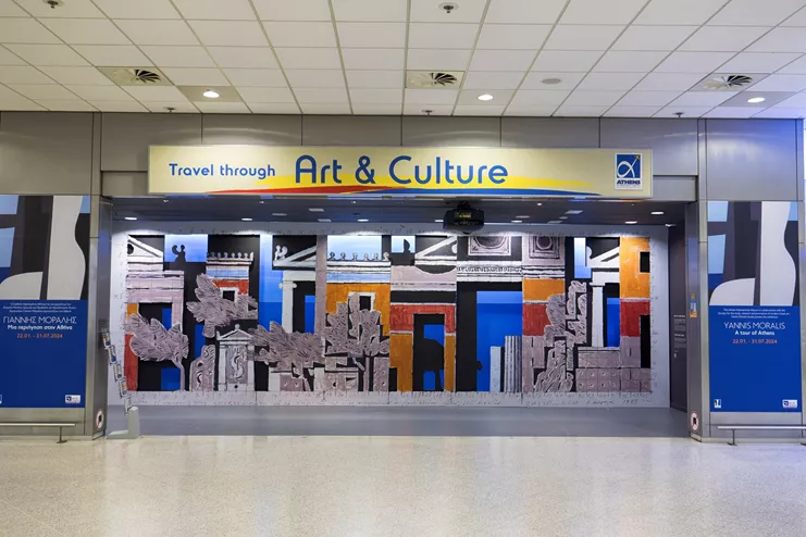 Η πρώτη συνεργασία του Διεθνούς Αερολιμένα Αθηνών και του Εργαστηρίου Γιάννης Μόραλης στοχεύει να συστήσει στους επιβάτες και επισκέπτες του αεροδρομίου τον κορυφαίο Έλληνα ζωγράφο, χαράκτη, σκηνογράφο και καθηγητή, ο οποίος άφησε ανεξίτηλο το στίγμα του στα εικαστικά δρώμενα της χώρας. Στον εκθεσιακό χώρο του «Ελευθέριου Βενιζέλου» εγκαταστάθηκε μία μακέτα σε μεγέθυνση για κεραμική σύνθεση τοίχου, που είχε δημιουργήσει ο ζωγράφος για το Νέο Δημαρχιακό Μέγαρο Αθηνών στην οδό Λιοσίων, η οποία απεικονίζει μια φανταστική διαχρονική όψη της πόλης, στο ύφος του Μόραλη. Με τον γραφιστικό διαχωρισμό της κυρίως παράστασης από τις σκιές της και το γαλάζιο του ουρανού και της θάλασσας, η εγκατάσταση ζωντανεύει το προσχέδιο του Μόραλη και το μετατρέπει σε τρισδιάστατο σκηνικό που καλεί τον επισκέπτη να το ανακαλύψει.