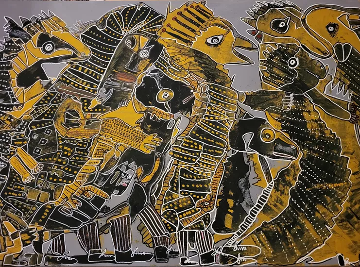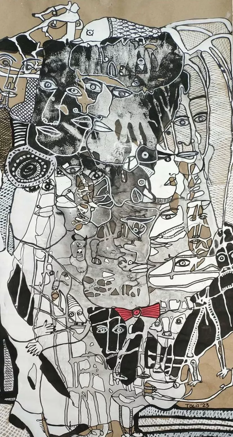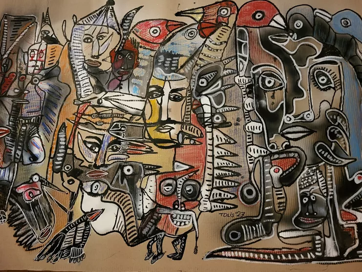 Μινώταυροι και Σάτυροι, Κάρμεν και Αρχάγγελοι, Μήδεια και Αρλεκίνοι, σύμπαν και κβαντική συνθέτουν το εικαστικό περιβάλλον του Γιώργου Τόλη, όπου ξεχειλίζουν έντονα χρώματα, αμέτρητα σχήματα, πρόσωπα και γραμμές. Ο καλλιτέχνης ζωγραφίζει εικόνες, μορφές, τα βιώματά του, προτιμώντας να περιπλανιέται σε παράξενα μονοπάτια της τέχνης. Η ζωγραφική του Γιώργου Τόλη δεν είναι συμβατική. Όνειρα, σύμβολα, ασυνήθιστες αντιπαραθέσεις προτρέπουν το θεατή σε διαρκή εξερεύνηση, σ‘ ένα διαφορετικό και πολύ απαιτητικό ταξίδι γνώσης, εξομολόγησης και τελικά, αυτογνωσίας. Τα έργα του δίνουν μια άλλη προοπτική στη σύγχρονη ελληνική τέχνη: αντι-ακαδημαϊκή, ωμή και άμεση, εκφραστική, πολύπλοκη και πολυπολιτισμική, διεθνή και βαθιά ανθρώπινη.