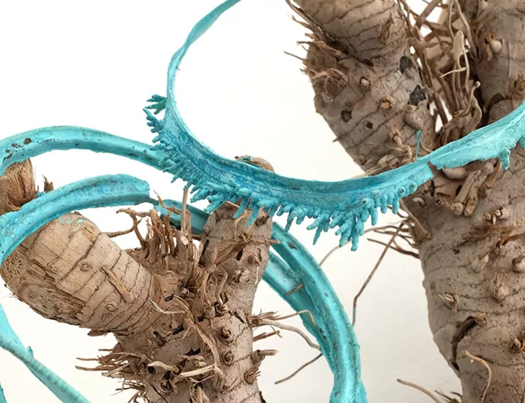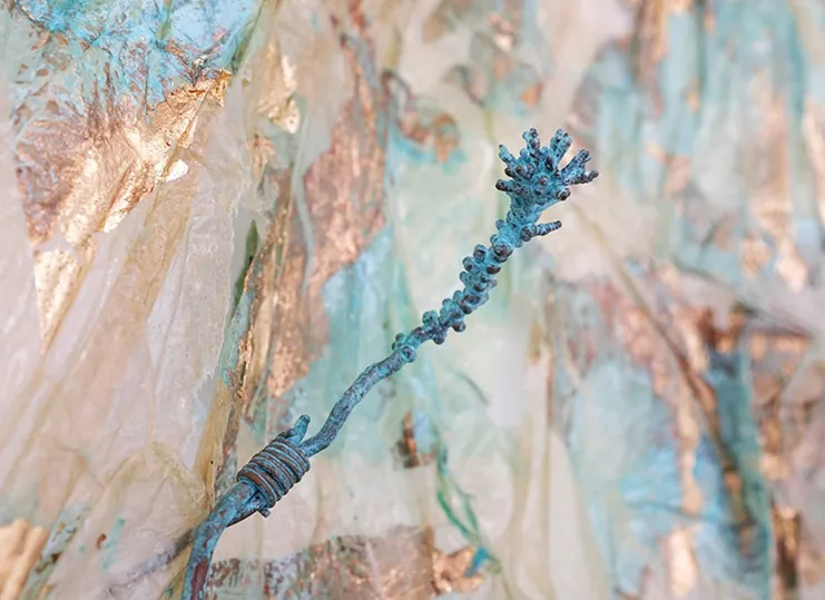 Oι φράσεις της ποιήτριας Anne Carson απηχούν τις εντάσεις μεταξύ έμψυχου και αδρανούς, μεταξύ ζωής, μύθου και ύλης. Αυτή ακριβώς η ρευστότητα των παραπάνω σχέσεων αντικατοπτρίζεται στην έκθεση της Στεφανίας Στρούζα μέσα από έναν φαντασιακό τόπο, στον οποίο έχει αφήσει τα ίχνη της μια μυθική οντότητα γνωστή ως το Χρυσόμαλλο Δέρας. Εδώ η ιστορία του Δέρατος σχετίζεται με την ικανότητα της ζωής να αναδύεται με πολλαπλούς τρόπους, διασχίζοντας ακόμα και τα στάδια της απουσίας της. Εύθραυστα υλικά και θραυσματικές μορφές ορίζουν μια συνθήκη ευαλωτότητας αλλά και διασυνδέσεων ανάμεσα σε ποικίλες εκδοχές της ύπαρξης. Στον κεντρικό χώρο, τα αναρτημένα έργα από χαρτί παραπέμπουν σε σώματα υβριδικά που ενώ μοιάζουν να βρίσκονται σε αποσύνθεση, την ίδια στιγμή αναγεννιούνται και διαχέονται στον χώρο, διαμορφώνοντας εκ νέου τις σχέσεις μεταξύ τους αλλά και με το περιβάλλον τους. Την κατακόρυφη διάταξη των έργων διακόπτουν κεραμικά γλυπτά με ενσωματωμένες ρίζες καλαμιών που σχηματίζουν ένα νοητό οριζόντιο επίπεδο που υπονοεί την επιφάνεια της Γης. Στον σύγχρονο κόσμο της κλιματικής αλλαγής, των ανεξέλεγκτων πυρκαγιών, των εξορύξεων και της εξαφάνισης των ειδών, τι επιβιώνει και υπό ποια μορφή; Το μυθικό πλάσμα που διατρέχει την έκθεση αναφέρεται στη ριζοσπαστική ετερότητα που αντιστέκεται στον ανθρώπινο πολιτισμό.