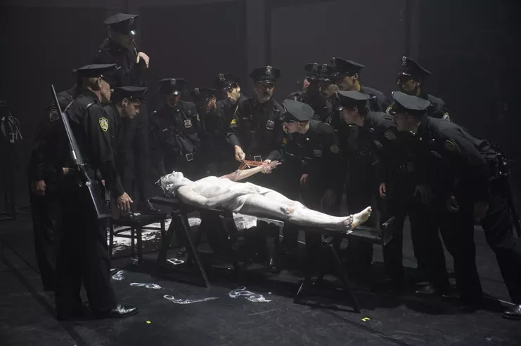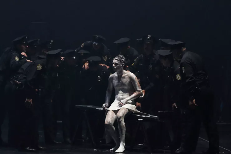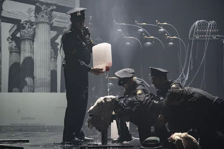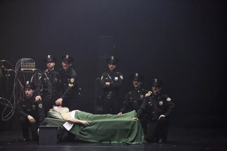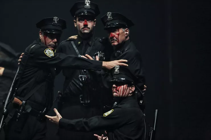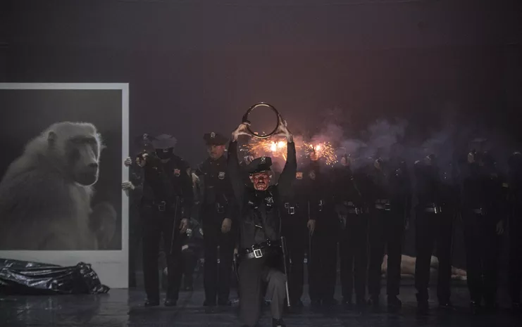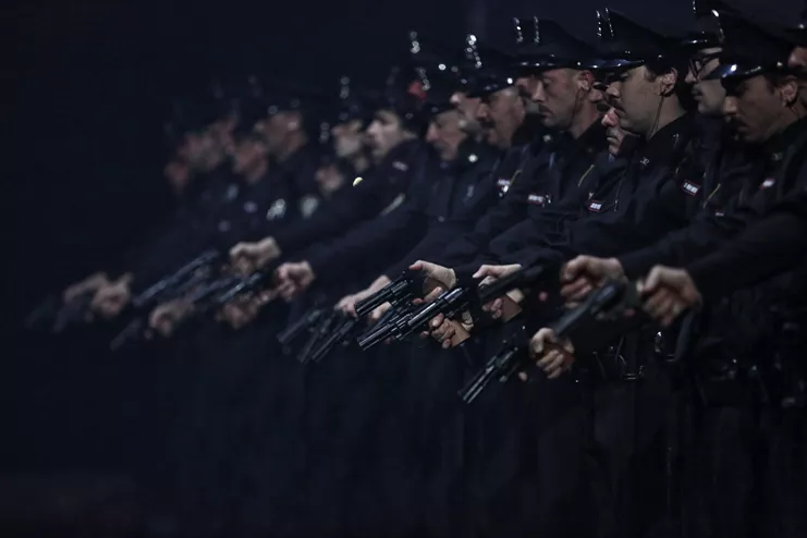Ο πρωτοπόρος Ιταλός δημιουργός στήνει μια μεγαλειώδη οντολογική φάρσα, στον πυρήνα της οποίας υπάρχει το παγκόσμιο ζήτημα της αστυνομικής βίας. Με είκοσι τρεις άνδρες επί σκηνής -με τη συμμετοχή ερασιτεχνών ηθοποιών- εξετάζει πώς λειτουργούν ως ένα σώμα μόλις φορέσουν στολή.