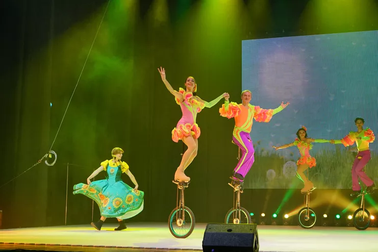 Χορεύουν 35 χορευτές και ακροβάτες του εθνικού ακροβατικού συγκροτήματος Κούβας.