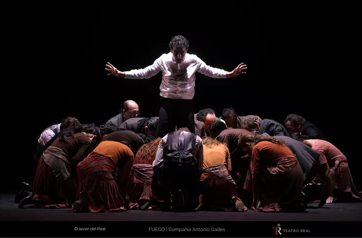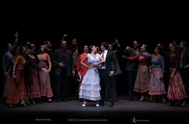 Αντλώντας από τη μουσική του συνθέτη Μανουέλ ντε Φάγια για το μπαλέτο «Ο Μάγος Έρωτας», μία ιστορία που εξερευνά την πολύπλοκη δυναμική της αγάπης, της έλξης και της προδοσίας, οι δύο δημιουργοί παρουσιάζουν μια μυσταγωγική παράσταση που κινείται στους παθιασμένους ρυθμούς του αυθεντικού ισπανικού φλαμένκο. Η 25μελής ομάδα του Αντόνιο Γκάδες, αποτελούμενη από χορευτές, μουσικούς και τραγουδιστές, μεταλαμπαδεύει επί σκηνής, ολόκληρη τη φιλοσοφία, την αισθητική και την καλλιτεχνική ηθική του μεγάλου χορογράφου, εμβαθύνοντας στα θέματα του πάθους, της θυσίας και του αγώνα για κυριαρχία. Το «Fuego» είναι η ιστορία ενός βαθιά ερωτευμένου νεαρού ζευγαριού, που η σχέση τους περιπλέκεται όταν ένας χαρισματικός και σαγηνευτικός ταυρομάχος μπαίνει στη ζωή τους. Ο ταυρομάχος σαγηνεύει τη γυναίκα και προκαλεί ένταση και ζήλια μεταξύ των δύο ανδρών. Τα έντονα συναισθήματα της αγάπης, της επιθυμίας και της αντιπαλότητας εκφράζονται μέσα από τον δυναμικό χορό και τη μουσική του φλαμένκο.
