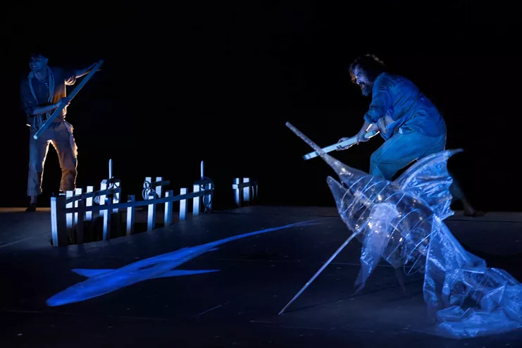 Το έργο είναι μια διασκευή βασισμένη στο κλασικό και βραβευμένο με Πούλιτζερ έργο «Ο γέρος και η θάλασσα» του Έρνεστ Χέμινγουεϊ μετά το οποίο του απονεμήθηκε και το Νόμπελ λογοτεχνίας. Περιγράφει την ιστορία ενός ψαρά, του Σαντιάγο και το ταξίδι του στην ανεξερεύνητη θάλασσα και την επική συνάντησή του με ένα υπέροχο μπλε μάρλιν, το οποίο κατάφερε να ψαρέψει μετά από 84 ημέρες χωρίς ψαριά. Το ψάρι είναι πολύ δυνατό, ο Σαντιάγο δεν καταφέρνει να το σκοτώσει και εκείνο αγκιστρωμένο από την πετονιά του, τραβάει αυτόν και τη μικρή του βάρκα όλο και πιο βαθιά στη θάλασσα για τρεις μέρες και τρεις νύχτες. Ο Σαντιάγο τελικά καταφέρνει να σκοτώσει το ψάρι αλλά επειδή είναι πολύ μεγάλο για να χωρέσει στη βάρκα το δένει στο πλάι της. Στο δρόμο της επιστροφής καρχαρίες του επιτίθενται και τρώνε όλη τη σάρκα του πελώριου ψαριού. Κάτω από αυτή την απλή ιστορία, κρύβεται ένας κόσμος πλούσιος σε συμβολισμούς και μεταφορές για την αναζήτηση του σκοπού, την αντοχή του ανθρώπινου πνεύματος και τη συγκρουσιακή σχέση του ανθρώπου με το φυσικό περιβάλλον.