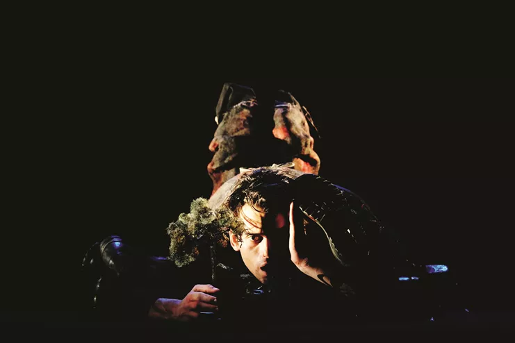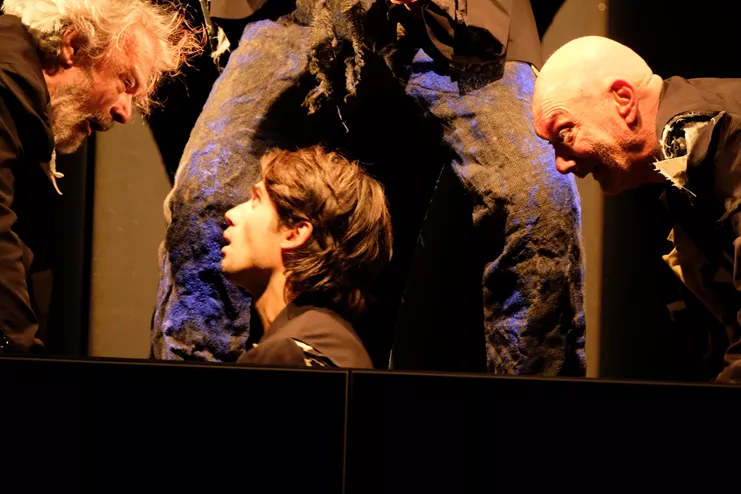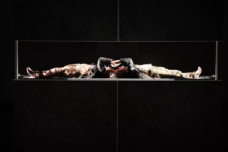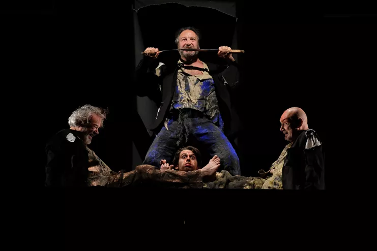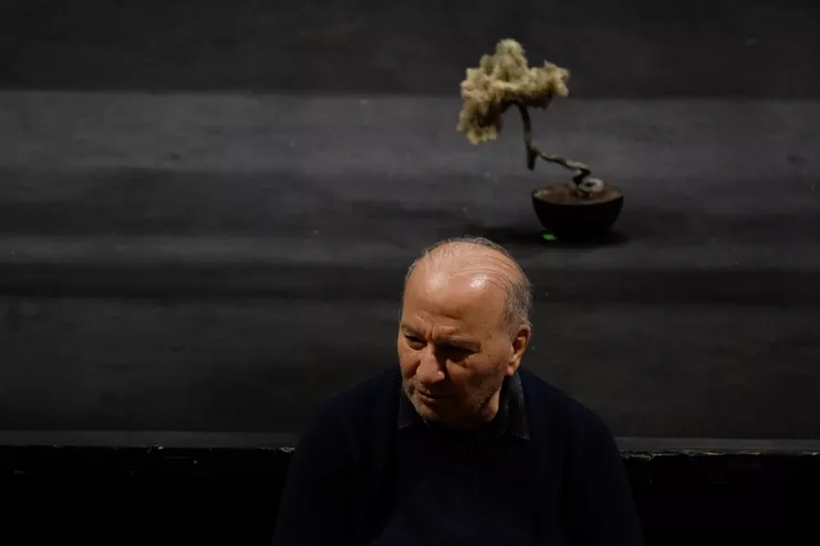 «Τίποτα δεν είναι πιο πραγματικό από το τίποτα» είχε δηλώσει ο Σάμιουελ Μπέκετ (1906-1989) και με το “Περιμένοντας τον Γκοντό” (1948) εκσφενδονίζει σαν μετεωρίτη αυτό το «τίποτα» πάνω στη σκηνή. Γιατί τίποτα το αξιοσημείωτο, σε επίπεδο δράσης και υπόθεσης, δεν συμβαίνει σε αυτό το έργο του νομπελίστα Ιρλανδού στοχαστή, ποιητή και συγγραφέα. Δύο παρίες του δρόμου, δύο κλοσάρ, ο Βλαδίμηρος και ο Εστραγκόν, ντυμένοι με τα κουρέλια τους, στέκονται πλάι σε ένα δέντρο, μιλούν περί ανέμων και υδάτων, συναντιούνται τυχαία με τρεις εξίσου περίεργους τύπους, ενώ κατά βάση περιμένουν κάποιον άλλον που δεν έρχεται ποτέ. Ποιος είναι, τελικά, ο Γκοντό του τίτλου που δεν εμφανίζεται ποτέ; Κάποιος σωτήρας ή ακόμα και ο ίδιος ο Θεός, όπως φανερώνει η παραφθορά του ονόματος στα αγγλικά (Godot, από το God = Θεός); Αυτή την αέναη αναμονή σκηνοθετεί με όρους κωμικοτραγικής ιερουργίας ο Θεόδωρος Τερζόπουλος. Στην παράστασή του, που είναι σε συμπαραγωγή με το Emillia Romagna Teatro, ένα μαύρο ικρίωμα, σαν νεκρικό μνημείο, ορθώνεται στη σκηνή. Ένας σταυρός από φως το σκίζει στα δύο. Στη βάση του, ένα μικροσκοπικό μπονζάι. Εκκλησιαστικοί ύμνοι, ταγκό, βομβαρδισμοί και σειρήνες πολέμου αντηχούν.