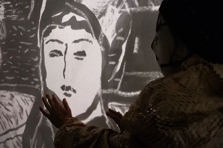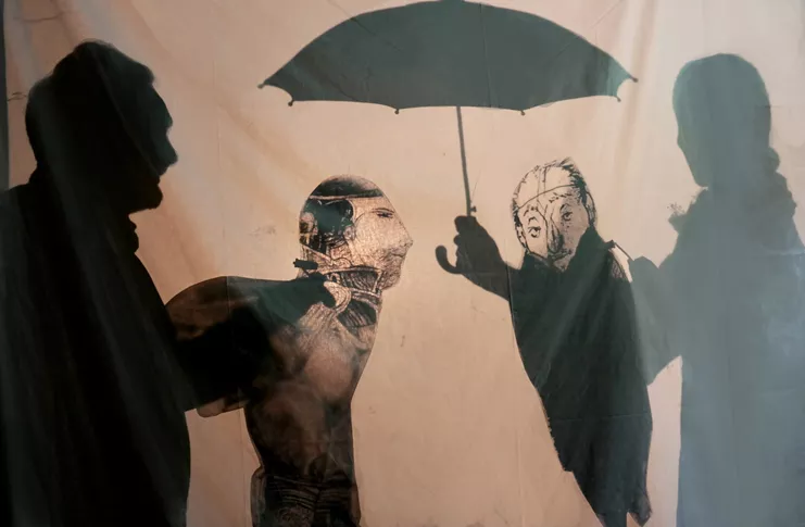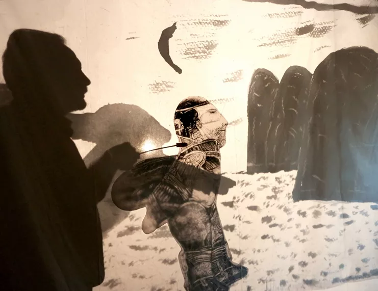 Ένα παράξενο θέατρο σκιών, το οποίο είναι φτιαγμένο από τις φιγούρες των έργων του Νίκου Χουλιαρά, ζωντανεύει το μυθιστόρημά του, “Ο Λούσιας”. Μέσα από τη ζωγραφική του ξεπηδούν οι ήρωες του έργου του. Ο Λούσιας καθρεφτίζεται στον μπερντέ, διπλασιάζεται αλλά και πολλαπλασιάζεται. Στα νερά της λίμνης αντανακλούν οι σκιές μιας πραγματικότητας που είναι παραμορφωμένη. Η σκληρότητα και η υποκρισία φανερώνεται μέσα από ένα παιδί - καθρέφτη. Το απολωλός, ο λωλός της πόλης, εκείνος που είναι “αδύναμος στα μυαλά” και φαίνεται “αλαφροΐσκιωτος” είναι αυτός που απομένει για να μας θυμίζει την τρυφερότητα. Στην παράσταση τις φιγούρες θεάτρου σκιών χειρίζεται ο Άθως Δανέλλης.