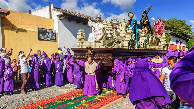 Σχεδόν μεσάνυχτα. Μεγάλη Τετάρτη. Παρόλο που το υψόμετρο δεν ξεπερνά τα 1500 μέτρα, κάνει αρκετό κρύο. Στο ιστορικό κέντρο της Αντίγουα οι λιθόστρωτοι δρόμοι είναι γεμάτοι κόσμο, όμως επικρατεί απόκοσμη ησυχία. Σπίτια και μαγαζιά έχουν σκεπάσει με μωβ υφάσματα τις προσόψεις τους από πάνω ως κάτω. Με την σιωπή και το πένθιμο αυτό χρώμα οι ντόπιοι καθολικοί συμπάσχουν συμβολικά και, παρά την κούρασή μας, η ατμόσφαιρα δεν γίνεται να μας αφήσει ασυγκίνητους. Από την ολονύκτια αγρύπνια του καθεδρικού San Jose απόψε θα περάσει όλη η πόλη. Κάτω από την διακριτικά φωτισμένη αψίδα της Santa Catalina, αρχίζουν αθόρυβα οι αυριανές ετοιμασίες. Ινδιάνες φέρνουν λεκάνες με λουλούδια, πέταλα και χρωματιστά ροκανίδια, - φούξια, πορτοκαλί, γαλάζια κλπ- λεπτά σαν αλεσμένα.