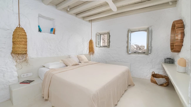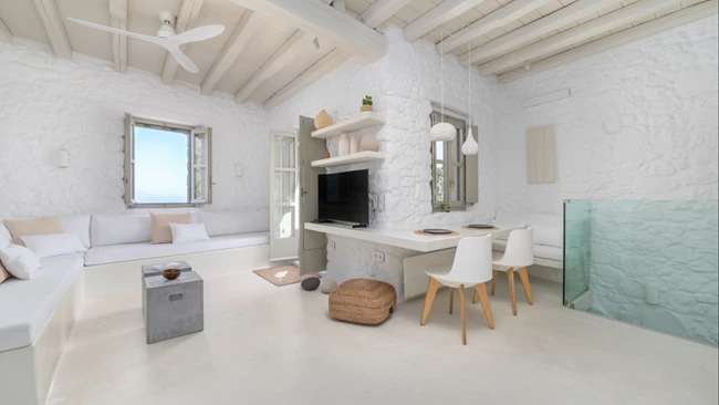 Παράθυρα που βλέπουν τη θάλασσα για να ταξιδέψουν τη ματιά, να αποκαλύψουν ορίζοντες και να υποσχεθούν το "παραπέρα", χαρίζουν στην κατοικία "Fragoseco" αύρα χαλάρωσης κι επανασύνδεσης με την ηρεμία του Αιγαίου, ενώ ο ενιαίος χώρος στον όροφο οδηγεί σε μια υπέροχη βεράντα με κομψό σκίαστρο, που χαρίζει τη δική της μοναδική θέα στο γαλάζιο της θάλασσας και στα κοντινά νησιά.